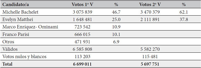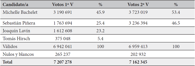 La campaña de Bachelet combinó sus atributos como popular ministra de Defensa con la alta popularidad del presidente saliente, Ricardo Lagos (Gamboa y Segovia, 2006; Morales, 2008; Navia, 2006; 2007). Su candidatura fue una mezcla de continuidad y cambio. Continuidad porque fue el cuarto gobierno consecutivo de la Concertación y cambio, ya que sería la primer mujer elegida democráticamente como presidenta (Morales, 2008; Navia, 2007). La alta votación femenina que obtuvo Bachelet fue atribuida a la solidaridad de género (Morales, 2008), pero sus cualidades personales ayudaron a que su candidatura generara confianza y credibilidad (Morales, 2008: 14). En la Alianza, mientras Lavín buscó el apoyo de sectores populares, Piñera se centró en captar votos del votante de derecha y al electorado más moderado de la Concertación (Gamboa y Segovia, 2006). El cuadro 1 resume los resultados de esa elección.