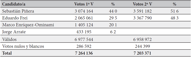 En 2009, se presentaron cuatro candidatos, pero disputaron la segunda vuelta Piñera, por la Alianza, y Eduardo Frei por la Concertación. Si bien Frei se benefició de la alta popularidad de Bachelet, no fue suficiente para darle la victoria. En su periodo presidencial anterior (1994-2000), Frei terminó con una baja aprobación presidencial. Además, la candidatura de Marco Enríquez-Ominami también debilitó su votación en primera vuelta (Morales y Navia, 2010). En síntesis, Frei representaba más continuidad que cambio, en tanto que Piñera mostró una candidatura innovadora e inclusiva, que rompía con las posiciones más conservadoras de la derecha tradicional. El cuadro 2 muestra los resultados de esta elección, la cual representa una ruptura con las anteriores, ya que por primera vez desde 1958 ganó un presidente de derecha (Morales y Navia, 2010).