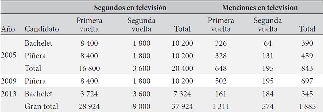 Los 37 924 segundos en televisión analizados para las cuatro campañas presidenciales se distribuyen de la siguiente forma. Tanto en 2005 como en 2009, a cada uno de los cuatro candidatos le correspondieron 8 400 segundos de tiempo en televisión en primera vuelta (5 minutos diarios por 28 días). En la segunda vuelta, de 2005, cada candidato tuvo 1 800 segundos y, en 2009, 3 600 segundos. En la primera vuelta de 2013, el análisis contiene 3 724 segundos por candidato. En la segunda, se analizarán 3 600 segundos de publicidad. El cuadro 4 muestra la cantidad de segundos que tuvieron Bachelet y Piñera en las dos ocasiones en que cada uno de ellos se presentó como candidato.