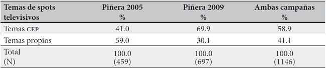 El cuadro 6 muestra el total de menciones que hizo en sus campañas televisivas. Este total incluye prioridades que aparecen en la pregunta de la Encuesta CEP y prioridades que el propio candidato incorporó en su campaña. En 2005, Piñera enfatizó más los temas propios (59.0%) que las prioridades CEP (41.0). En 2009, en cambio, se enfocó más en las prioridades CEP (69.9%) que en sus temas propios (30,1%). Ya que en 2005 Piñera competía con Lavín por el voto de derecha, es comprensible que, en primera vuelta, su foco haya estado en las prioridades de los electores de derecha. Pero en 2009, cuando era el único candidato de derecha, su campaña se centró más en las prioridades CEP que reflejan los intereses de la población en general.
