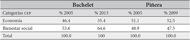 El cuadro 7 muestra el porcentaje de menciones CEP distribuidas entre las categorías economía y bienestar social en las cuatro franjas televisivas. Bachelet, en sus dos campañas, habló más de cuestiones sociales. En 2013, el porcentaje de alusiones a dichos temas sobrepasa 60% entre todas las relativas a temas CEP. Mientras que Piñera, tanto en 2005 como en 2009, habló más de temas económicos y políticos.