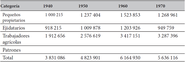 Muchas de estas poblaciones eran indígenas, monolingües y con una economía familiar de autosubsistencia. En 1950, del total de 98 590 localidades en todo el país, 97 607 tenían menos de 2 500 habitantes, con una población de 14 790 299 habitantes en conjunto, sobre una población total de 25 779 254; 57% de los habitantes de la nación vivía en estos núcleos de población. Para 1970 el total de localidades con menos de 2 500 habitantes disminuyó a 95 410, con 19 916 682 habitantes, sobre una población total en el país de 48 225 238, es decir, 41% (Aguilar y Graizbord, 2001: 586, cuadro 7). Esta distribución espacial de la población -fenómeno común en América Latina- incrementó las desigualdades sociales y condicionó la calidad de los servicios que recibían las poblaciones, en la medida en que los beneficios sociales en educación, salud, agua potable, se hacían más costosos para poder acceder a ese tipo de población dispersa y distante de los centros urbanos que concentraban los servicios a distribuir y los recursos presupuestales para hacerlo. La población agropecuaria económicamente activa se incrementó de la siguiente forma: en 1940 eran 3 831 086 trabajadores; en 1950, 4 823 901; en 1960 la población ocupada en el campo alcanzó su máximo: 6 164 930, para empezar a decrecer al final de la década; en 1970 bajó a 5 636 116 trabajadores (Cuadro 1).