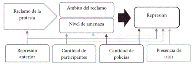La hipótesis de esta investigación es que existe un comportamiento diferenciado de la policía frente a las manifestaciones de acuerdo con el ámbito del reclamo planteado; la probabilidad de represión aumenta cuando se percibe la protesta como amenazante y el reclamo se dirige al ámbito federal/nacional, lo que se sale de la competencia del gobierno local y, por lo tanto, no hay punto de negociación posible. Dependiendo de la demanda y de la percepción e información que tiene sobre el tipo de manifestantes que acudirán, el gobierno calcula la posibilidad de que éstos recurran a la violencia y califica el grado de amenaza de la protesta, según su radicalidad y amplitud (ver adelante operacionalización); si la amenaza es alta, el gobierno empleará la represión.