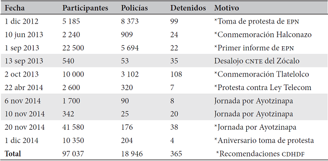 Durante el periodo de 2012 a 2014 en el Distrito Federal hubo un comportamiento diferenciado de la policía en algunas protestas con respecto a su actuación histórica y a otras protestas en el mismo lapso. Antes de esa fecha la CDHDF realizó sólo una recomendación por violaciones a derechos humanos durante una protesta (CDHDF, 2007), mientras que de 2013 a 2016 efectuó nueve, relativas a eventos en los años 2012 a 2014 (CDHDF, 2013-2016). De acuerdo con las recomendaciones de la CDHDF y la información del área de sistematización del Comité Cerezo, los eventos con detenciones arbitrarias fueron los que se presentan en el Cuadro 1 (ver notas 3 y 4):
