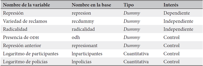 Para analizar este periodo represivo en el D.F. se pone a prueba el modelo analítico descrito previamente con la base de datos que se construyó para este propósito (Cuadro 2).
