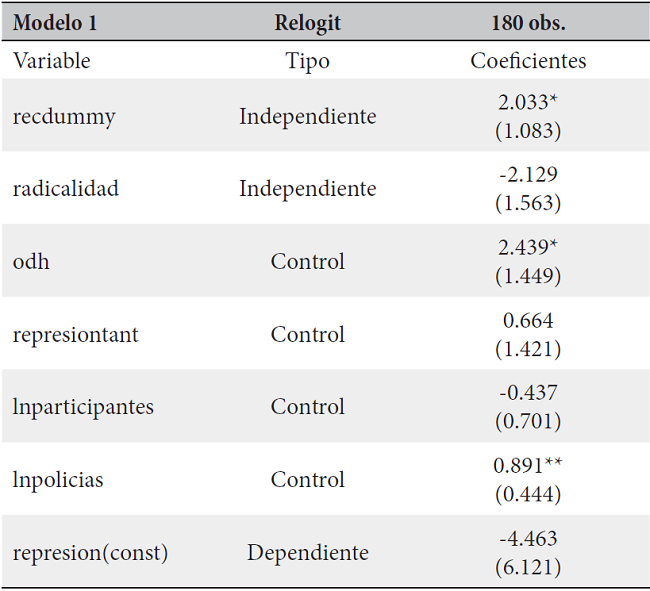 In ( )=4.463 recdummy + 2.033recdummy -2.129radicalidad + 2.439odh + 0.664represionant - 0.437ln participantes + 0.891lnpolicias