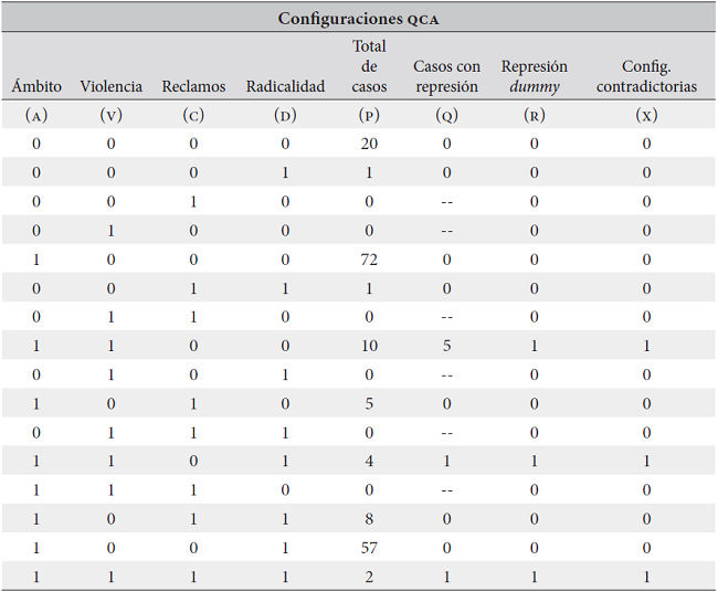 La tabla de verdad de esta investigación está compuesta por ocho columnas (Cuadro 5): las primeras cuatro corresponden a las variables independientes que determinan las configuraciones posibles; después se tiene una columna informativa de cuántos casos (P) presentan tal configuración, seguido de una columna que indica la cantidad de casos de represión (variable dependiente) en esa configuración, indicada con la letra Q; en la siguiente columna se plasma la variable dependiente en forma dicotómica (de acuerdo con la presencia o ausencia de casos en esa configuración, señalada con la letra R) y en la última columna, denominada X, se señala si las configuraciones son contradictorias (que producen resultados tanto positivos como negativos en la variable dependiente). Dado que se tienen cuatro variables independientes, la matriz contiene 16 configuraciones posibles.