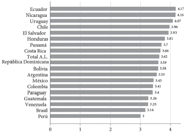 El Gráfico 1 muestra las medias de confianza política observadas en los 18 países latinoamericanos. La confianza política para toda la muestra es de 3.62, ubicándose 8 países sobre este valor. La lista es encabezada por Ecuador, con 4.17 puntos, seguido por Nicaragua (4.16) y Uruguay (4.07), siendo los únicos tres países en presentar un valor superior a 4 en el índice de confianza política. En la parte baja se ubican Venezuela con 3.25; Brasil, 3.16 y Perú, 3. La diferencia entre el país que muestra el mayor nivel de confianza política y el que muestra el menor, en este caso Ecuador y Perú, es de 1.17 puntos.