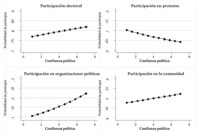 Frente a la discusión en torno a si los ciudadanos más confiados o que muestran menores niveles de confianza son los más propensos a involucrarse en actividades políticas, los resultados permiten sostener que para las formas más convencionales de participación, como acudir a votar en las elecciones, asistir a las reuniones de alguna agrupación política o participar en la comunidad, mayores niveles de confianza política explican mejor estos tipos de participación. Los latinoamericanos que más confían en el conjunto de instituciones políticas son, en términos generales, más participativos que aquellos que desconfían, mostrando una mayor inclinación a privilegiar mecanismos convencionales de participación para hacer escuchar su voz a las autoridades políticas. No obstante, esto no significa que quienes desconfían se queden en casa, interpretando la desconfianza como un desmovilizador de la acción política. Como muestran los resultados, cuando se trata de modalidades menos convencionales, como la protesta, los ciudadanos más desconfiados son los que más participan.