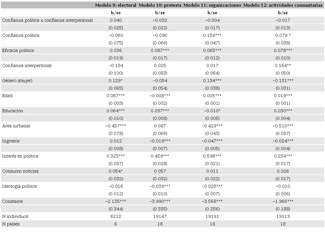Esta investigación tuvo por objetivo poner a prueba dos hipótesis adicionales referidas a los efectos combinados de la confianza política con la eficacia política, así como con la confianza interpersonal. Como señalé antes, una de las hipótesis más discutidas en la literatura sobre los efectos de la confianza en la participación política es la formulada por Gamson (1968). Sin embargo, los resultados obtenidos no permiten dar respaldo a dicha hipótesis para el caso de los latinoamericanos, no sólo porque los análisis muestran que esa interacción no es significativa para la participación en protesta ni para la participación en la comunidad en los diferentes modelos ejecutados, sino porque en los casos de participación electoral y participación en organizaciones, el efecto es incluso opuesto al esperado: la confianza política y la eficacia se refuerzan mutuamente, de manera tal que mayores niveles de confianza y eficacia política, de manera combinada, incrementan la probabilidad de participar políticamente.