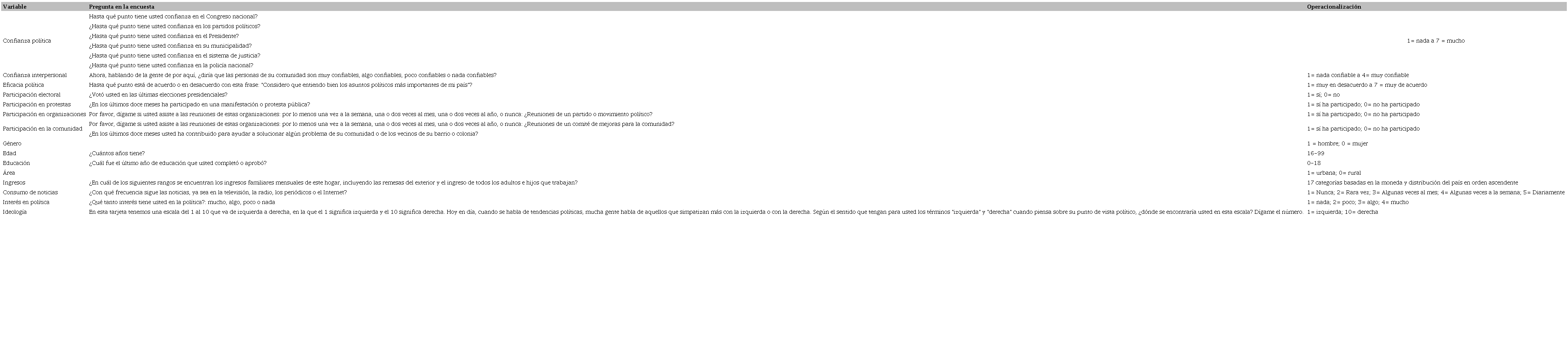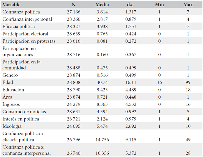 Las otras dos variables de interés corresponden a la confianza interpersonal y la eficacia política interna. La primera está medida a través de la pregunta: “Ahora, hablando de la gente de por aquí, ¿diría que las personas de su comunidad son muy confiables, algo confiables, poco confiables o nada confiables?; Las respuestas van en la escala de 1 a 4. Como medida de la eficacia interna, se preguntó: “¿Hasta qué punto está de acuerdo o en desacuerdo con esta frase?: ‘Considero que entiendo bien los asuntos políticos más importantes de mi país’”, cuyos valores de respuesta se distribuyen en una escala de 7 puntos. Estas variables fueron incluidas de dos maneras en los modelos estadísticos: en forma individual y a través de una interacción con la confianza política.