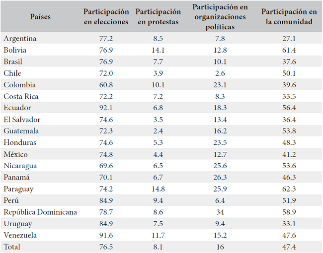 El Cuadro 1 presenta los niveles de participación reportados para cada uno de los países que componen la muestra. En términos generales, se logra apreciar que acudir a votar e involucrarse en actividades de la comunidad son los dos mecanismos de participación más ejercidos por los latinoamericanos: mientras 76.5% de los entrevistados señaló haber votado en la última elección presidencial, 47.4% afirmó haberse involucrado en acciones relacionadas con su comunidad. Respecto de la participación en agrupaciones políticas, sólo 16% afirmó haber asistido a reuniones en el último año, mientras que apenas 8.1% reportó haber participado en manifestaciones o protestas públicas.