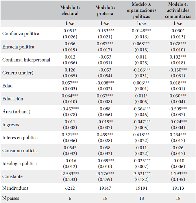 Adicionalmente, el análisis estadístico comprende un conjunto de variables de control que han resultado significativas en estudios previos sobre participación política. Estas variables se incluyen en todos los modelos estadísticos. Si bien es cierto que estudios previos han concluido que diversos modos de participación pueden explicarse a través de distintas variables (Klesner, 2007), utilizar modelos similares permite una mejor comparabilidad del efecto relativo de nuestras variables de interés (Norris, 2002; Salzman, 2015). Por tal motivo, en primer lugar incluí variables sociodemográficas como la edad, el género y la zona de residencia de los entrevistados, lo mismo que socioeconómicas, como el nivel de educación y el ingreso reportado (Dalton, 2017; Verba, Schlozman y Brady, 1995). El signo de la relación dependerá del tipo de participación analizada. Por ejemplo, habrá más participación electoral entre las personas de mayor edad, mientras que la participación en protesta será mayor entre los jóvenes (Hooghe y Marien, 2013; Norris, 2002). Asimismo, se incluyó el interés de las personas en la política. Como muestran diversas investigaciones, el interés en la política está asociado positivamente con el involucramiento en diversas modalidades de participación (Norris, 2002), en particular para la electoral (Carreras y Castañeda-Angarita, 2014; Haime, 2017). De igual modo, el consumo de noticias también ha resultado ser un predictor positivo de la participación política en América Latina (Del Tronco, 2015; Salzman, 2015). Finalmente, como última variable de control incluí la identificación ideológica en el eje izquierda-derecha. La descripción y operacionalización de todas las variables incluidas en los modelos de regresión se encuentra en el anexo 2.