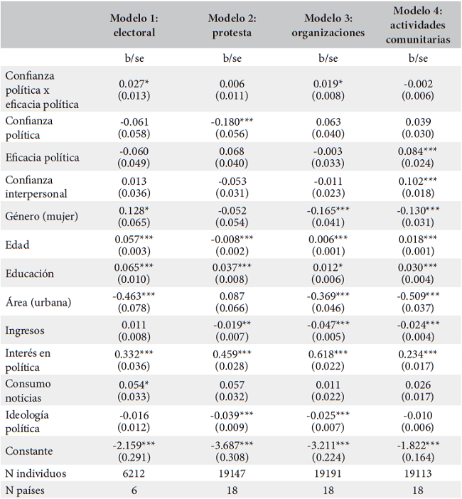 El modelo 3 corresponde a la participación en organizaciones políticas. Como se observa, los resultados confirman la expectativa inicial del efecto positivo de la confianza política sobre la participación en organizaciones. De acuerdo con estos resultados, la confianza incrementa 11.8% la probabilidad de participar en organizaciones políticas. En relación con el resto de las variables, la eficacia política, el género, mayor nivel de educación formal, el área de residencia, un mayor interés en la política, declarar menores ingresos y la ideología política son variables significativas para explicar el involucramiento de los latinoamericanos en organizaciones políticas.