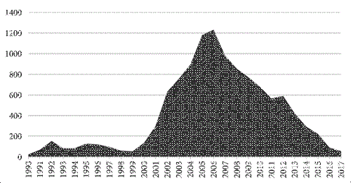 Estas armas, definidas en términos técnicos como artefactos que explosionan “por la presencia, la proximidad o el contacto de una persona” (Ministerio de Defensa de Colombia, 2015), han sido empleadas en Colombia fundamentalmente por los grupos guerrilleros (en especial por las ahora desmovilizadas Fuerzas Armadas Revolucionarias de Colombia, FARC, y por parte del Ejército de Liberación Nacional, ELN). El primer reporte de su empleo se remonta al menos a 1974, cuando se tiene reporte del primer empleo de esta arma por parte del ELN (Revista Cambio, 2004: 46), aunque es sólo desde 1990 cuando se lleva un registro de la victimización que han producido estos artefactos y los remanentes explosivos de guerra (reg). Estos últimos, definidos como “municiones abandonadas o usadas sin explosionar” (Ministerio de Defensa de Colombia, 2015) coinciden con las map en tanto son también activadas por la propia víctima. Como lo analiza de forma profunda el informe del CNMH y la Fundación Prolongar (2011: 37), las lógicas de su empleo están relacionadas en particular a su uso como estrategia de defensa en momentos de ofensiva militar y para proteger “activos estratégicos”, tales como campamentos o cultivos de uso ilícito (CNMH y Fundación Prolongar, 2011: 91). Esto explica que el pico de víctimas de map en Colombia empieza a formarse a partir del desarrollo del Plan Colombia a finales de la administración Pastrana y durante la ofensiva militar del primer periodo de la administración Uribe (gráfico 1). El aumento en este periodo es visible: tomando datos de la Dirección para la Acción Integral contra Minas Antipersonal (DAICMA, 2018), puede observarse que mientras en la década del 90 el promedio de víctimas de map fue de 85 por año, en los primeros seis años del nuevo milenio el promedio ascendió a 797 por año. En contraste, el gráfico permite visualizar que la caída en el número de víctimas de estos artefactos coincide con el periodo del proceso de paz entre el gobierno colombiano y las FARC durante el año 2012, cuando se da inicio a la fase pública de los diálogos de paz y hay un descenso pronunciado de número de víctimas, con una caída notable en el año 2016, cuando se acordó el cese bilateral al fuego entre el gobierno colombiano y esa guerrilla.