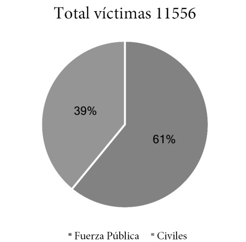 Al 31 marzo de 2018, estos artefactos explosivos habían producido 11 556 víctimas oficiales en Colombia (gráfico 2). Se trata de una cifra que parece quedar eclipsada detrás de la enorme cantidad de víctimas producida por otras formas de victimización en el país, como por ejemplo el desplazamiento forzado, que a la misma fecha de corte tiene 7 371 504 personas reportadas en el Registro Único de Víctimas (RUV), es decir, cerca de 600% más víctimas que las de map.