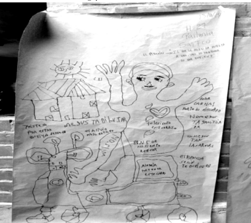 Al momento de pedirle ubicar ciertas sensaciones y sentimientos en alguna parte de la representación de su cuerpo, concretamente la tristeza, dijo: “siento la tristeza en las manos porque no puedo trabajar” (taller de reconstrucción de memoria, San Francisco, agosto 13 de 2014). Al pedirle que ubicara la alegría, el perdón, el propio amor, manifestó “no siento ninguna de esas emociones”.