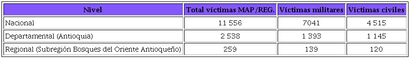 El departamento de Antioquia encabeza la lista de victimización a nivel nacional. Concentra 22% de todas las víctimas y 25% si hablamos únicamente de civiles (1 145 en total). La afectación allí ha estado condensada particularmente en tres zonas: el norte, el nordeste y el oriente del departamento. Dentro de esta última zona se encuentra la denominada subregión de Bosques, conformada por tres municipios (Cocorná, San Francisco y San Luis), donde se ha dado el mayor número de víctimas. Esta subregión, ubicada a escasos 80 kilómetros de Medellín (la capital departamental), ha tenido presencia guerrillera desde la década del 70, especialmente del ELN. Las víctimas reportadas por minas antipersonal en los tres municipios que conforman esta zona suman 259, de las cuales 120 han sido civiles (tabla 1). Es en esos tres municipios donde realizamos el trabajo de campo que sustenta este artículo.