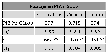 Se puede apreciar cómo un mayor puntaje en la prueba PISA se asocia con un mayor nivel del ingreso nacional por persona4 y con una menor desigualdad.
