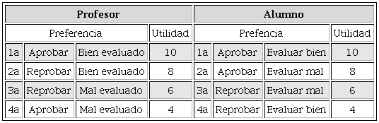El ordenamiento de preferencias no amerita mayor explicación, salvo el lugar destacado que para el profesor ostenta la buena evaluación de los alumnos; y la preeminencia de la aprobación, sobre cualquier otra cosa, para estos últimos. El juego y su resultado se presentan a continuación: