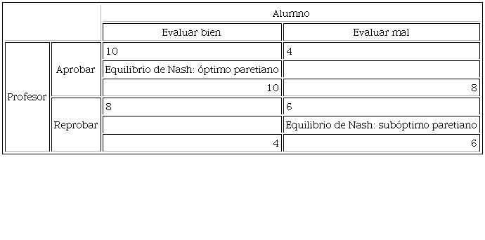 Como se puede advertir, el juego desemboca en dos equilibrios de Nash, lo cual anuncia que es un juego típico de coordinación (Gibbons, 1992). Sin embargo, el primero (Aprobar-Evaluar bien) es un óptimo de Pareto, porque en la sociedad que conforman alumnos y maestros todos los miembros alcanzan la máxima utilidad conjunta (10+10=20) y porque nadie puede mejorar sin que el otro empeore. De hecho, en cualquier combinación de estrategias distintas, ambos pierden. El segundo (Reprobar-Evaluar mal) es el caso usual del subdesarrollo: es un subóptimo, en el que existe la posibilidad de mejoras paretianas y en el que la sociedad en su conjunto obtiene menos utilidad (6+6=12) de la que podría obtener.