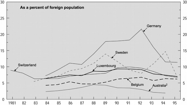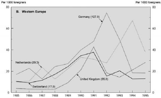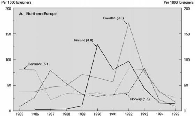 Para ilustrar lo anteriormente dicho, podemos poner el caso del aumento sustancial de la cantidad de personas que migraron como consecuencia de la caída del Muro de Berlín, del derrumbe del bloque soviético y de la desparición de la URSS. Las siguientes gráficas, proporcionadas por la Organización para la Cooperación y el Desarrollo Económicos (OCDE, 1997) demuestran cómo, a finales de los años ochenta y principios de los noventa, hubo un incremento crucial en el número de inmigrantes en ciertos países desarrollados: