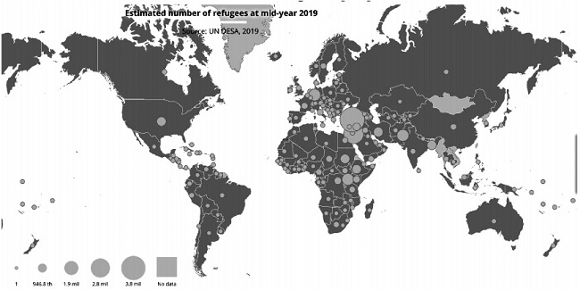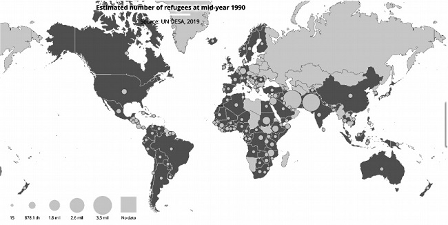 Se corrobora, en estos mapas, la diversificación de población en busca de refugio alrededor del mundo. Si en 1990 (Mapa 1), la distinción entre círculos grandes y pequeños era muy visible, en 2019 (Mapa 2), hay una proliferación de puntos pequeños a lo largo del planeta. Esto quiere decir, que los destinos de los migrantes forzados se han multiplicado de manera evidente.