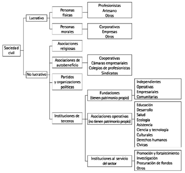 Desde la teoría clásica sobre el papel de las organizaciones de la sociedad civil desarrollada en los Estados Unidos, aquéllas representan una esfera de acción privada a través de la cual los individuos pueden tomar la iniciativa, expresar su individualidad y ejercer la libertad de expresión y acción (Salamon, 1996; Diamond, 1994). A diferencia del sector lucrativo, las organizaciones de la sociedad civil tienen la obligación de representar algún interés público (Eikenberry, 2004; Manor, 1999).
