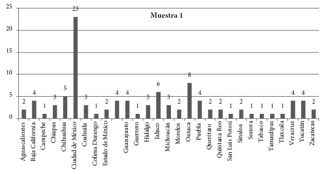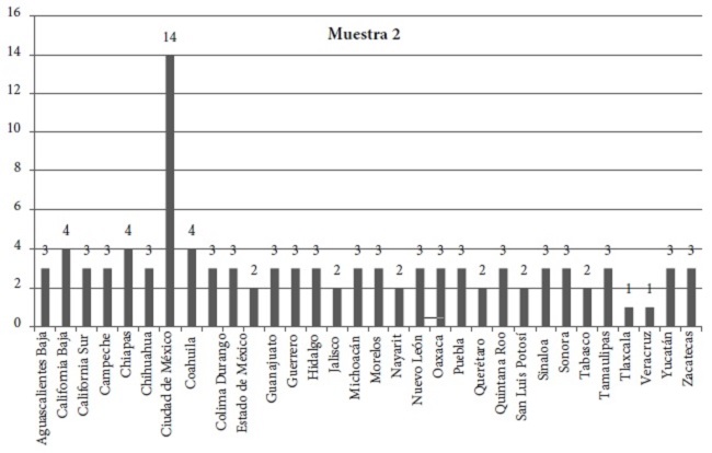 La muestra de la categoría de “asociaciones de auto beneficio” se integró a partir de la actualización al 13 de enero del 2017 del Directorio Nacional de Organizaciones de la Sociedad Civil que registraba, a esa fecha, un total de 8 145 organizaciones de ambos tipos (asociaciones de auto beneficio y organizaciones de servicios a terceros). Primero se procedió a depurar a las organizaciones de servicios a terceros, debido a que ya se había integrado la primera categoría de la muestra, así como a las que tenían estatus de “inactivas”. La distribución geográfica de las OSC de la primera y segunda muestra se presenta en el Anexo 2.