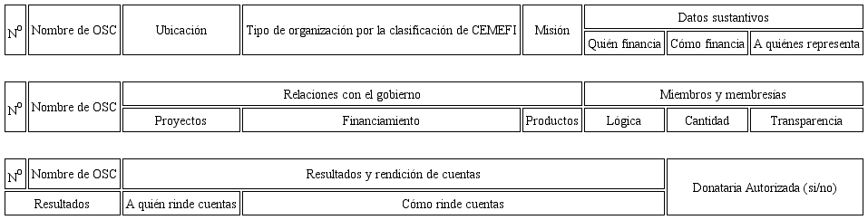 En este artículo se analizan los esfuerzos que realizan las OSC en México para transparentar información sustancial relacionada con sus intereses y su funcionamiento; de manera concreta se indaga sobre la publicidad de la relación que mantienen con el gobierno, la relación con sus miembros y los mecanismos que emplean para publicitar resultados y rendir cuentas (Tabla 1). A partir de una muestra (tomando para ello el Directorio de Inscripción al Registro Federal de Organizaciones de la Sociedad Civil del Instituto Nacional de Desarrollo Social, y del Directorio Nacional de Organizaciones de la Sociedad Civil de la Secretaria de Gobernación) se clasificaron bien como organizaciones de servicios a terceros o como asociaciones de auto beneficio para posteriormente, realizar las búsquedas en la internet de los cuatro rubros de información enunciados.