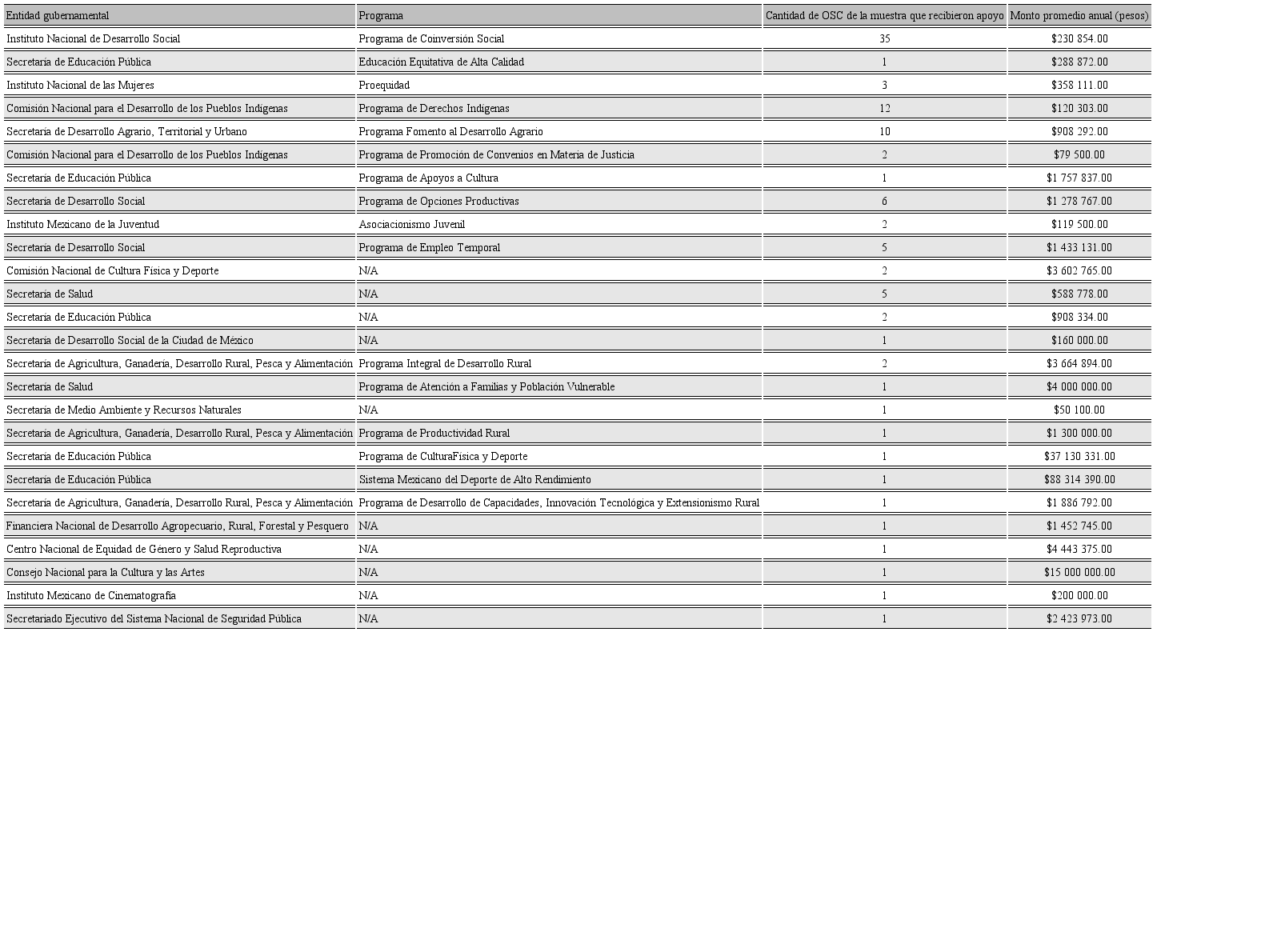 Del lado de las entidades gubernamentales hay más información disponible sobre el financiamiento que otorgan a las OSC. En estos casos los montos se presentan por año y por programa o entidad pública que otorga el financiamiento. Un total de sesenta organizaciones de la muestra recibieron apoyo del gobierno federal, mientras que los montos promedio de apoyo se muestran en la Tabla 2.