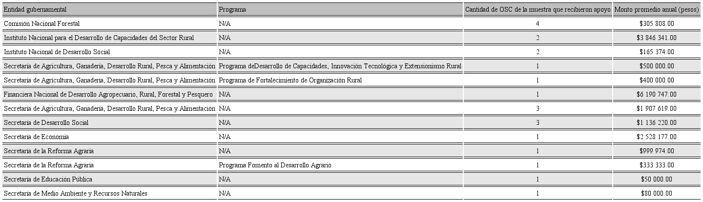 En lo que se refiere al financiamiento gubernamental, 13 organizaciones manifiestan haber recibido apoyos a través de diferentes programas públicos. Los montos promedio de apoyo por año se presentan en la Tabla 3.