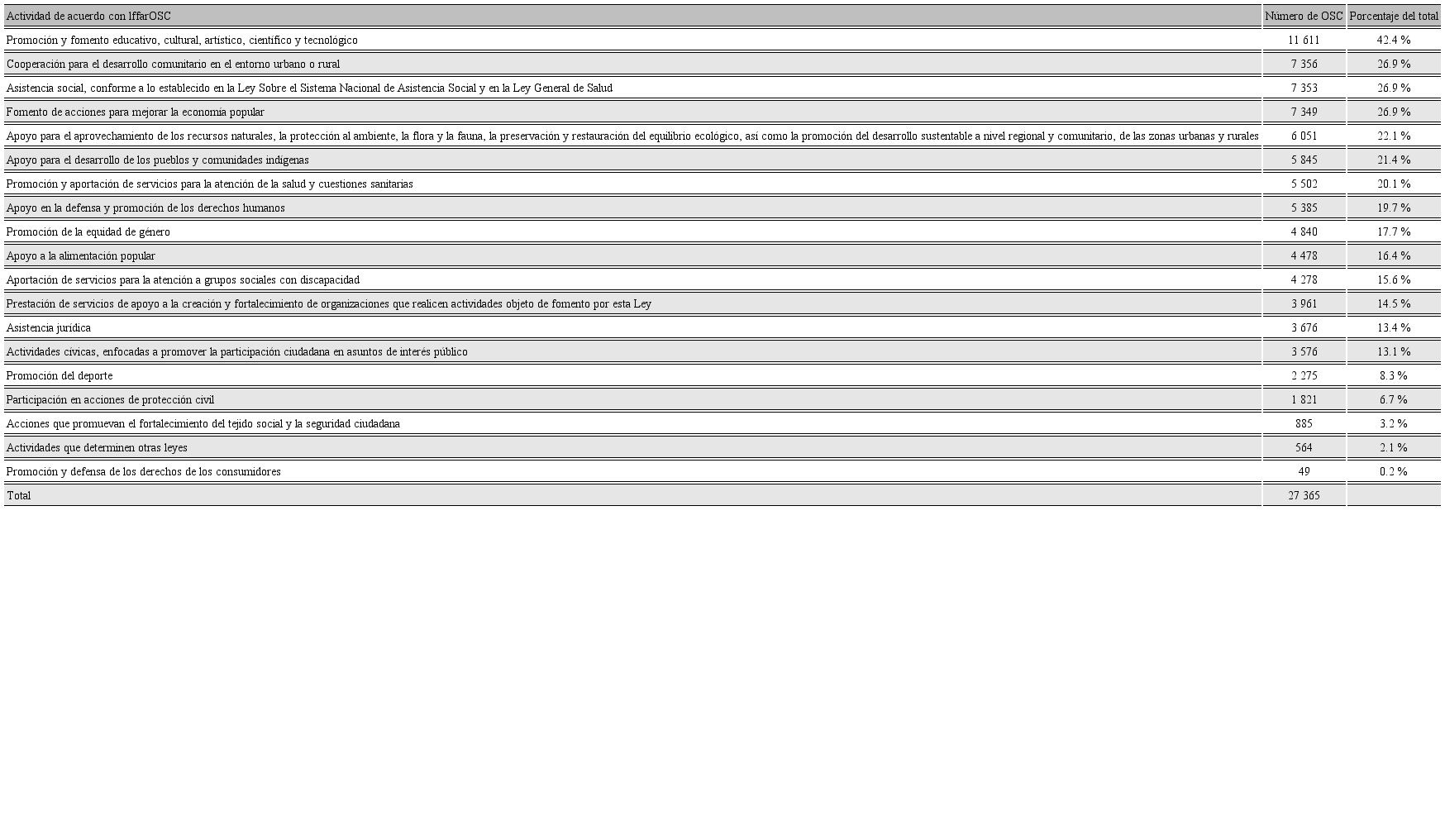 El Sistema de Información sobre Organizaciones de la Sociedad Civil de INDESOL contenía registros desde diciembre de 2004 hasta agosto de 2014. Estaba conformado por unos 27 000 registros de organizaciones inscritas. La actividad más frecuentemente registrada es la de “promoción y fomento educativo, cultural, artístico, científico y tecnológico” (42.4 %); le siguen la “cooperación para el desarrollo comunitario en el entorno urbano o rural” (26.9 %), “asistencia social” (26.9 %) y “fomento de acciones para mejorar la economía popular” (26.9 %) (ver Anexo 3). Las actividades registradas con menor frecuencia son la de “promoción del deporte” (8.3 %), “participación en acciones de protección civil” (6.7 %), “acciones que promuevan el fortalecimiento del tejido social y la seguridad ciudadana” (3.2 %), “actividades que determinen otras leyes” (2.1 %) y “promoción y defensa de los derechos de los consumidores” (0.2 %).