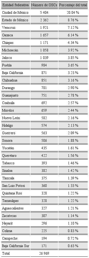 Por lo que respecta a la distribución geográfica se observa un sesgo importante pues una quinta parte -la mayoría de las OSC registradas- operan en la Ciudad de México (20.04 %). Otras entidades federativas con presencia importante de organizaciones son el Estado de México (8.76 %), Veracruz (7.12 %) y Oaxaca (6.14 %) (ver Anexo 4). En el extremo opuesto se encuentran Colima (0.83 %), Campeche (0.72 %) o Baja California Sur (0.63 %). En términos de la relación entre OSC por habitantes, Tamaulipas tiene una OSC por cada 10 679 habitantes, Nuevo León una por cada 8 614 y Sinaloa una por cada 7 745. La mejor relación la tiene la Ciudad de México donde hay una OSC por cada 1 642 habitantes; y, como dato interesante, le siguen Oaxaca (una por cada 2 406) y Durango (una por cada 2 237).