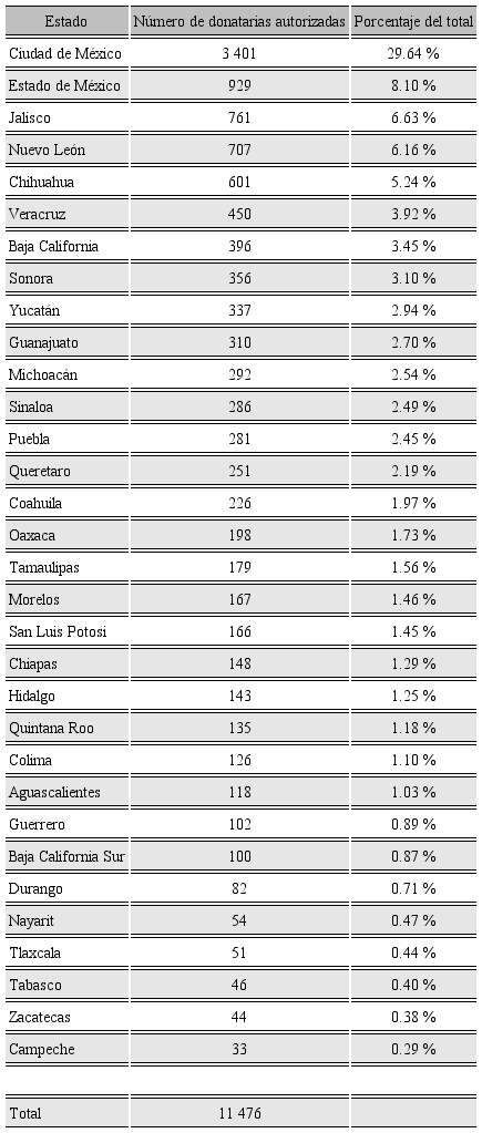 En lo que se refiere al número de donatarias autorizadas por la Secretaría de Hacienda y Crédito Público en 2017, el sesgo en la distribución geográfica se marca aún más. La mayor parte de ellas (29.64 %) se ubica en la Ciudad de México, seguida del Estado de México (8.1 %) y de Jalisco (6.63 %). En Tabasco (0.4 %), Zacatecas (0.38 %) y Campeche (0.29 %) se registra el menor número de donatarias (ver Anexo 5).