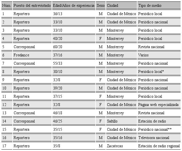 La muestra estuvo compuesta de 17 reporteros y/o editores de diferentes tipos de medios de comunicación (Tabla 1). El participante más joven tenía 30 años y el mayor tenía 60. Once participantes son del sexo masculino y seis del sexo femenino. Los nombres de los entrevistados son omitidos en cumplimiento del compromiso establecido con los participantes al acordar la entrevista, siguiendo el protocolo de investigación con personas de la institución de adscripción al hacer el estudio.