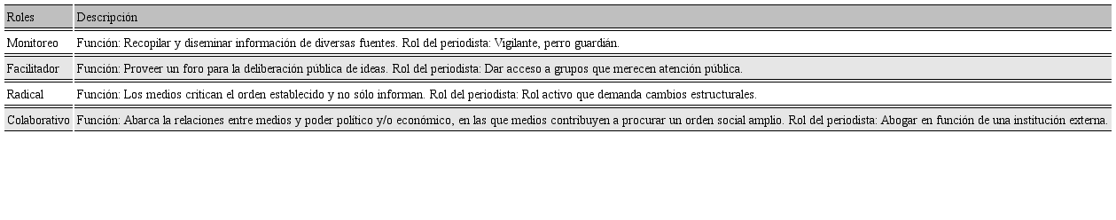 Así, los roles mediáticos que Christians, Glasser, McQuail, Nordenstreng y White (2009) describen, y que son utilizados como marco para la interpretación en este estudio, son los siguientes: de monitoreo, facilitador, radical y colaborativo. El predominante de los cuatro roles en las democracias occidentales, el papel de monitoreo, se refiere a ser un vigilante, un “perro guardián” que recopila y publica información de interés para el público y distribuye información en nombre de diversas fuentes. Según Christians y sus colegas, el papel facilitador implica la provisión voluntaria de acceso para grupos que merecen atención pública. El papel radical se refiere a cuando los medios de comunicación dan acceso a voces que están en contra del orden establecido, así como cuando los medios mismos son críticos y no solo informantes. Por último, el papel colaborativo comprende la relación entre medios y fuentes del poder económico o político, donde se pide a los primeros que cooperen en defensa de un orden social amplio como el desarrollo nacional. Esta tipología denota dos factores importantes: en primer lugar, los medios no operan en el vacío ya que están relacionados con otros actores y sus públicos; y, en segundo lugar, la relación de los medios con los actores poderosos y el grado de participación de los medios como actores sociales y políticos pueden variar considerablemente (Christians, Glasser, McQuail, Nordenstreng y White, 2009).