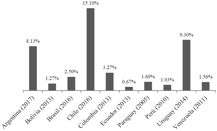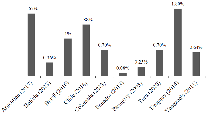 En Sudamérica, los datos referidos a la oferta -tales como incautaciones, extensión de las áreas de cultivo, detenciones de personas por delitos de drogas, entre otros- son medidos anualmente, mientras que la prevalencia de uso -proporción de las personas que han consumido al menos una vez en el último año sobre la población total- no es revelada con la misma frecuencia, como podemos apreciar en los siguientes gráficos, donde observamos que la actualización de datos más reciente es de hace dos años; la encuesta se realizó un año antes (2016) y se pregunta por las prácticas de consumo de 2015.