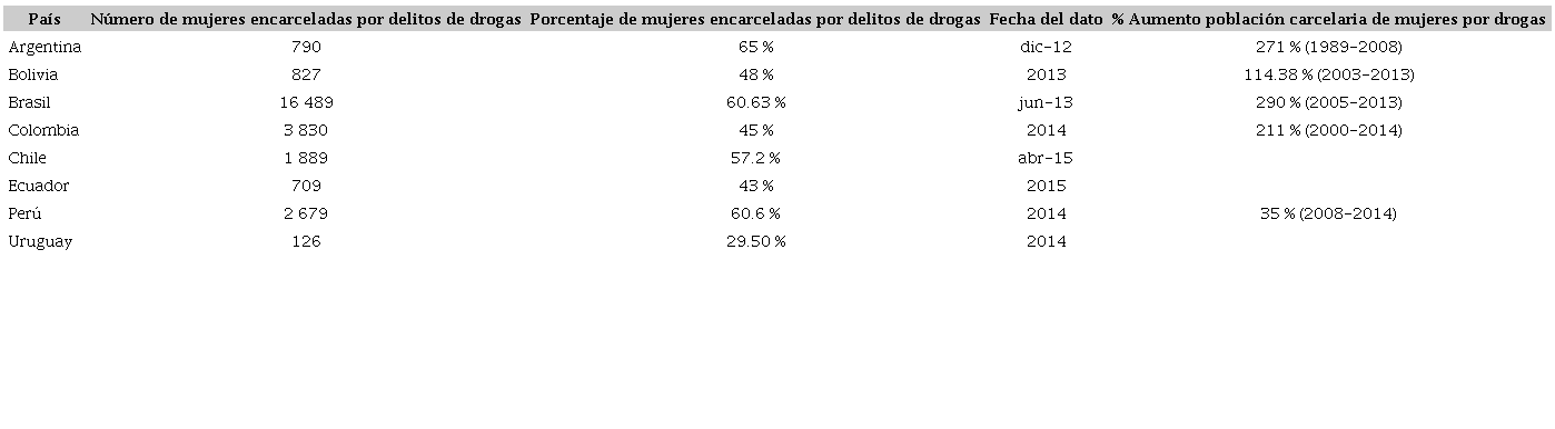 Youngers, Coletta y Nischa Pieris (2016) Mujeres, políticas de drogas y encarcelamiento. Una guía para la reforma de políticas en América Latina y el Caribe [en línea]. Washington Office on Latin America/Consorcio Internacional sobre Políticas de Drogas/Dejusticia/Comisión Interamericana de Mujeres de la Organización de los Estados Americanos. Disponible en: <Disponible en: https://www.wola.org/es/mujeres-politicas-de-drogas-y-encarcelamiento-guia-para-la-reforma-politica-en-america-latina-y-el-caribe/> [Consultado el 30 de agosto de 2016].