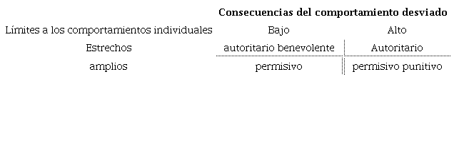 Cuando se relaja el régimen de sanciones, pero la conducta social continúa siendo regulada de manera estricta, encontramos el estilo autoritario-benevolente. Por el contrario, cuando los legisladores solamente imponen restricciones menores a las libertades individuales pero la violación a las mismas implica sanciones severas, predomina un estilo permisivo-punitivo de regulación.