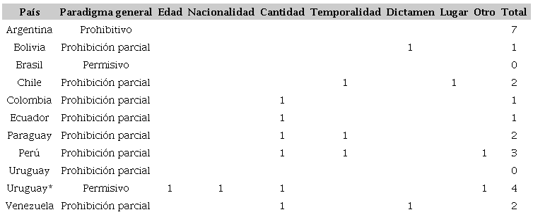Los siete requisitos considerados son: edad, nacionalidad, cantidad, temporalidad, dictamen, lugar, otros (ver Anexo I). Las primeras dos condiciones, edad y nacionalidad, son personales y se refieren a si la norma establece límites de edad o diferencia en el tratamiento a extranjeros. La cantidad alude a los topes de cantidad que algunos países han establecido para distinguir la posesión entre consumo y tráfico. La temporalidad está relacionada a la cantidad, es decir, si la regla considera que una persona supera el umbral permitido justificando el aprovisionamiento para consumo en el tiempo. El dictamen médico es incluido en algunas legislaciones como prueba de que la persona es consumidora. El lugar refiere a si la ley diferencia entre consumo en espacios públicos y privados. Finalmente, la categoría otros es para incluir requisitos no generales, por ejemplo, la condición peruana de que para el consumo personal no se pueden portar dos tipos de drogas, o el registro de datos personales de los usuarios de cannabis en el caso de Uruguay.