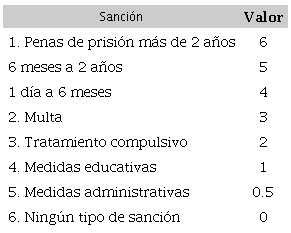 Las sanciones establecidas por las leyes de droga que regulan la tenencia de sustancias ilícitas fueron jerarquizadas tomando como criterio el grado de afectación de la libertad individual, las penas privativas de libertad con la más alta puntuación, pero se diferenció según el largo de la condena; luego, siguen las multas, los tratamientos de salud compulsivos, las medidas educativas y, por último, las disposiciones administrativas (ver Anexo II). En el caso de que la norma incluya dos o más sanciones se adiciona el puntaje.