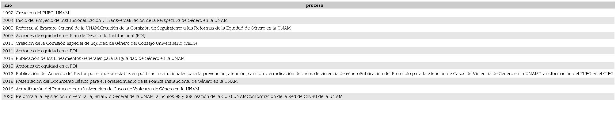 Estos procesos estuvieron acompañados por una serie de acciones y medidas de carácter general tales como actividades de formación, capacitación, campañas de prevención, talleres, estrategias de difusión, diagnósticos, etc. que han sido trascendentales para movilizar recursos institucionales en materia de transversalidad en las entidades. El Cuadro 1 resume este proceso de institucionalización y normatividad en materia de género en la UNAM: