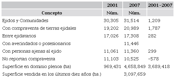 De ese modo, entre 1997 y el 2007 se había vendido ya una superficie total de 3 097 659 hectáreas pertenecientes a ejidos y comunidades en México (Cuadro 1). Por un lado, como se observa en el Cuadro 1, las operaciones de compraventa entre ejidatarios eran superiores a las realizadas con personas ajenas al ejido. Sin embargo, en el periodo entre 2001 y 2007, la superficie en dominio pleno aumentó en 380 %, lo que implicó un avance muy importante en el proceso de formalización del cambio de régimen de tenencia de la propiedad ejidal o comunal a propiedad privada.