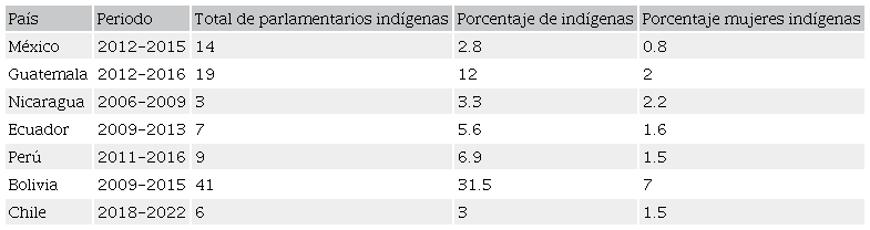 Los mismos estudios sostienen que Bolivia y Guatemala son los países con mayor representación política indígena, concentrada en la población masculina. En este terreno, la investigación informa que el fenómeno es más atenuado en Chile. Siguiendo estos datos, se puede observar la siguiente distribución de parlamentarios indígenas en los países latinoamericanos.