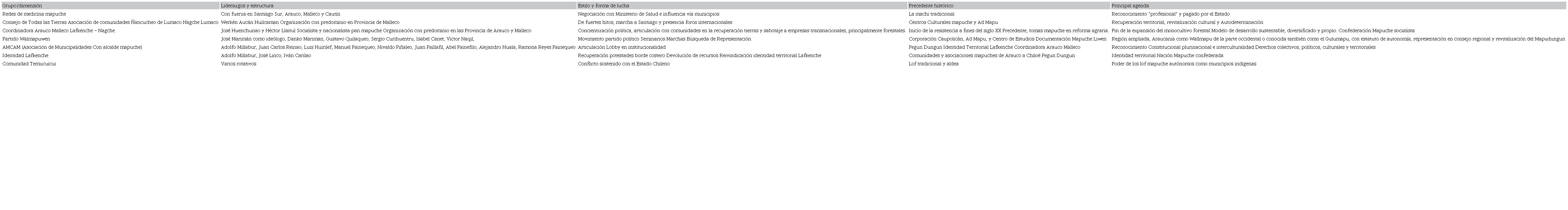 La literatura referida al caso mapuche presenta semejanzas y diferencias con los debates anteriores. El estado de avance de la investigación identifica desde estructuras fundadas en comunidades e identidades territoriales (Martínez, 2009; Tricot, 2013; Pairicán, 2014; Pu Lov, 2017), hasta formaciones de poder de mayor alcance territorial, de corte supraregionalista, nacionalista e institucionalista (Bengoa, 2000; Ancán, 2012; Menard, 2013; Espinoza, 2014; Cayuqueo, 2014; Caniguan, 2015; Marimán, 2017, Mella, 2020).