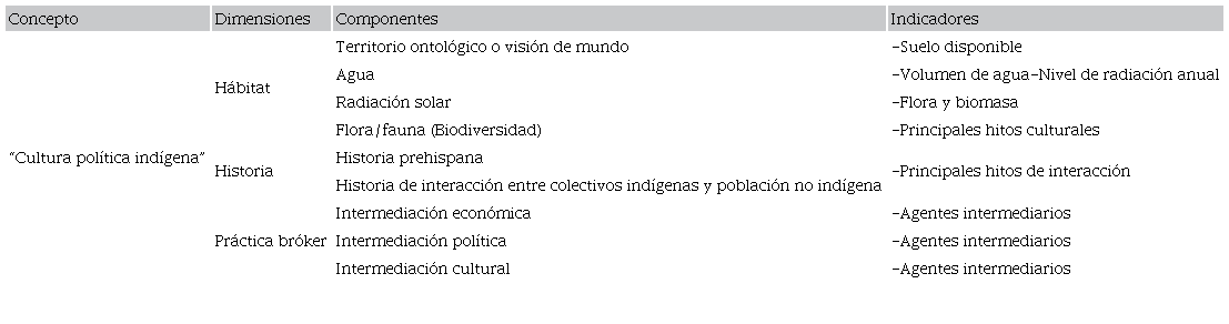 Para alcanzar este cometido, estimamos útil considerar los aspectos genéricos del caso abordado, para la formulación de un esquema de análisis que permita pensar la política indígena. Sobre esta base y rescatando la valiosa aproximación realizada por Natividad Gutiérrez y Damián Gálvez (2017) para el caso mapuche, contemplamos que el concepto que permite englobar estas estructuras es la idea de cultura política (Almond y Verba, 1963; Tejera, 1996; Eufracio, 2017; Ramírez y González, 2018). Desde esta perspectiva, la noción dispone de tres dimensiones a considerar: 1) hábitat; 2) historia; 3) práctica bróker. Se trata de tres dimensiones del objeto en que los casos estudiados presentan semejanzas a pesar de las importantes diferencias.
