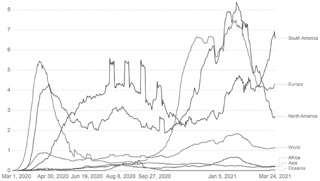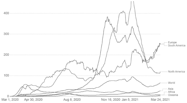 Our World in Data (s.f.c) Daily new confirmed covid-19 deaths per million people [en línea]. Disponible en: <https://ourworldindata.org/explorers/coronavirus-data-explorer?zoomToSelection=true&time=7..427&pickerSort=asc&pickerMetric=location&Metric=Confirmed+deaths&Interval=7-day+rolling+average&Relative+to+Population=-true&Align+outbreaks=false&country=OWID_WRL~Europe~North+America~South+America~Oceania~Africa~Asia>