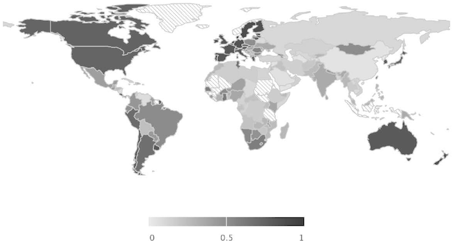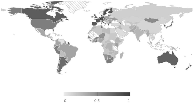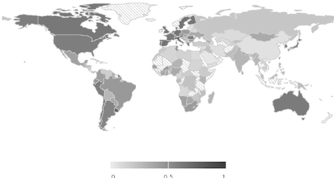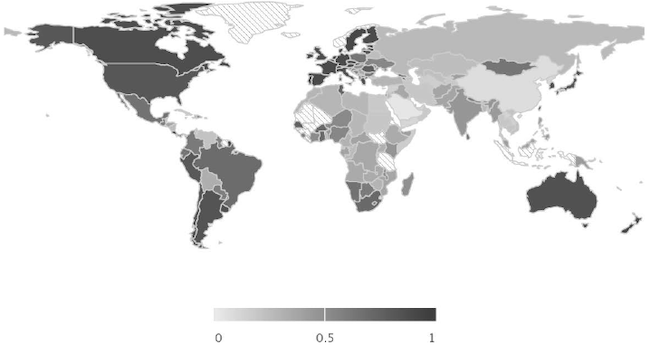 Si se comparan los datos del índice de violaciones de los estándares democráticos con el índice de democracia liberal previamente existente, que se muestra en la Imagen 6 (donde a mayor intensidad de gris mayor democracia estimada), se puede ver que existe una clara relación entre la presencia de un régimen autocrático y la violación de los estándares propios de la democracia que se han dado como consecuencia de la pandemia.