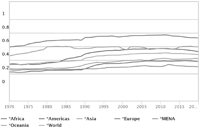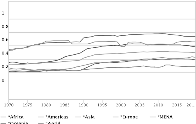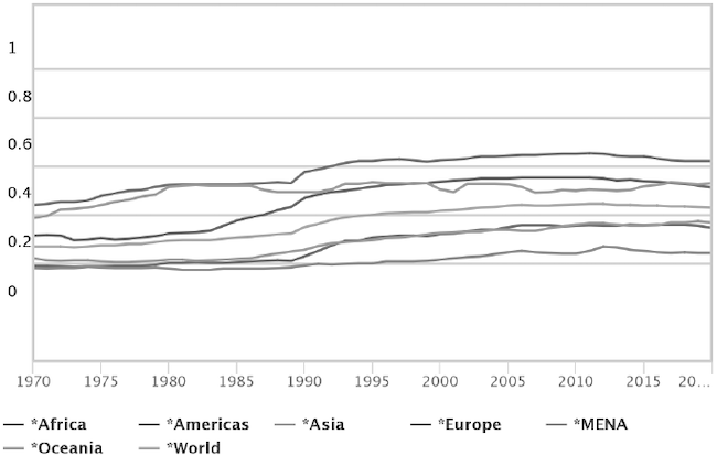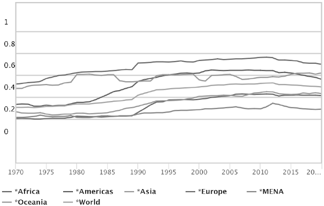 El declive de la democracia es más marcado cuando se observa el estimador de la democracia electoral, que se presenta en la Imagen 9. Ahí puede verse que el descenso reciente se ha dado prácticamente en todas las regiones, salvo Oceanía y Asia, y que ha sido más marcado en el caso de las Américas. Pero esto ocurre en un contexto donde la democracia electoral es más fuerte en Europa y América y menor en Asia y África (Imagen 10).